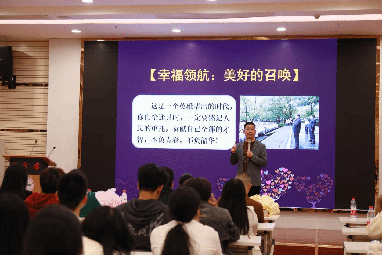 最后文学院党总支书记张云峰提出了三个引人深思的问题,“我们想成为什么样的老师?”、“我们想拥有什么样的生活?”以及“我们如何给自己精神画像?”,激发了同学们对师德师风、教育情怀的思考。他用生动而幽默的语言介绍了教师能力的七大方向,引导学生从“专业力”、“共情力”、“学习力”、“思想力”、“呈现力”、“故事力”和“个性魅力”这七个方面不断学习成长,从中华优秀传统文化汲取力量修炼“教育美好力”,早日成长为具有幸福领航能力的新时代人民教师。