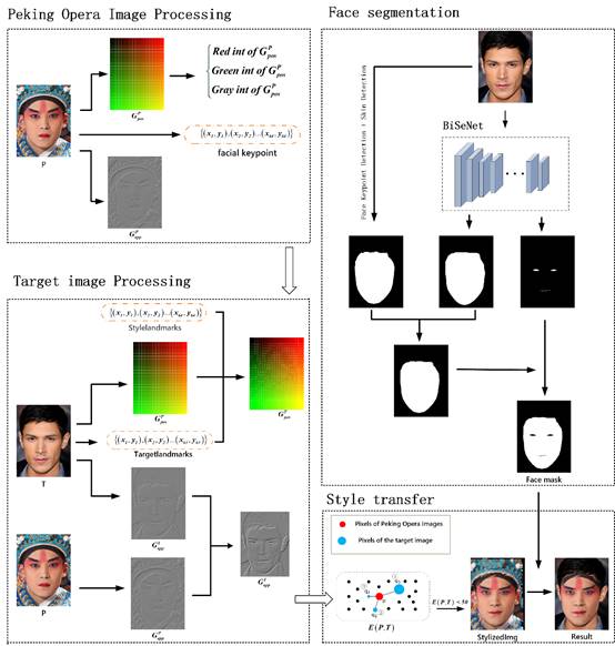 该论文是在我校梁小满教授的指导下完成,beat365唯一官网、智能信息处理与应用湖南省重点实验室为署名单位。论文核心理论是:当使用标准的神经网络迁移方法进行人像风格迁移时,往往不能保证语义上的正确转移;风格实例中的纹理细节往往被忽略。本文提出了一种名为POFMakeup的京剧脸谱风格转移方法,方法的技术路线如图1所示。这种方法可以将带有京剧脸谱的人像的风格转移到另一个人像上。该方法使用两个指南,位置指南和外观指南。位置指南保证了转移过程中语义的一致性,而外观指南则保证了转移过程中目标对象的外观能够被保留下来。实验结果表明,该方法不仅解决了传统人像风格转换的问题,而且能够快速、完美地实现京剧脸谱的风格转换。提出的方法在结构相似度(SSIM)方面比传统方法提高了17%。