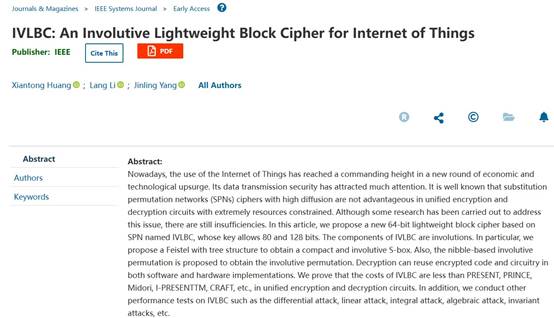 近日,beat365唯一官网2021级电子信息专业研究生黄现彤以第一作者在SCI二区期刊IEEE systems journal(2021年影响因子:4.802)发表研究论文,论文题目为《IVLBC: An Involutive Lightweight Block Cipher for Internet of Things》。