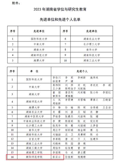 近日,湖南学位与研究生教育学会发布了“关于表彰2023年湖南省学位与研究生教育先进单位及先进个人的通知”,经材料审核,报湖南省学位办批准,湖南省学位与研究生教育学会2023年第2次常务理事会评选审定,beat365彭亚云老师获评为湖南省学位与研究生教育先进个人荣誉称号。
