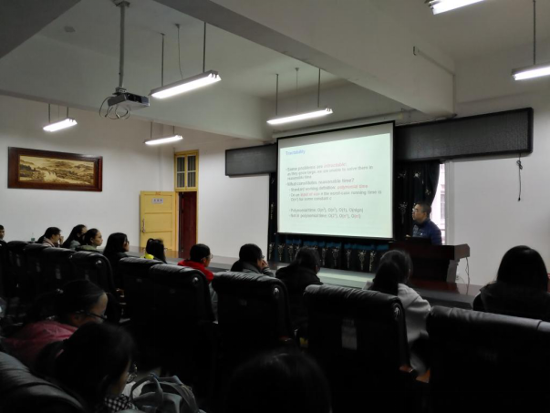 林老师通过对当前解决NP-难问题的方法优缺点进行分析,引入参数复杂性理论。对参数复杂性理论的发展现状、参数算法设计与分析技术、当前的研究方向与发展趋势等进行详细的介绍和分析,最后结合自己的科研对带供应与需求的树划分问题进行了深入的探讨。林老师的报告深入浅出,让同学们对参数复杂性理论领域的研究与发展有了较全面的了解。同时,向我们展示了先进的学术研究方法与理论。