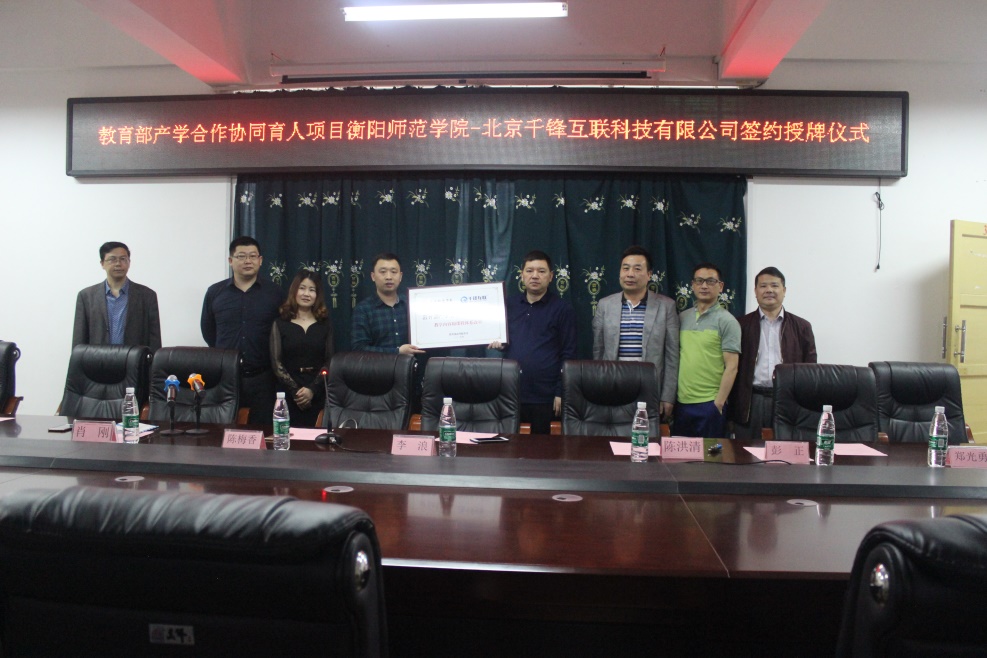 李院长代表计算机学院对肖刚一行表示欢迎,他简要介绍了学校和学院的基本情况,肯定了合作以来取得的成果,感谢北京千锋互联科技有限公司一直以来为计算机学院学生提供的实习实训,以及对beat365双师型师资培训工作以及2017年来对计科院在线课程资源的建设给予了大力支持。李院长希望通过本次的教育部产学合作协同育人“C++程序设计语言”项目的实施,进一步把双方的合作推向全方位战略伙伴型,同时,通过双方共同努力,培育一批面向社会、训练有素的创新应用型优秀本科生,通过校企合作真正实现理论教学转化为生产力。肖刚总监随后也介绍了北京千锋互联科技有限公司主要情况,高度评价了我校的人才培养质量,并希望通过此次项目合作,深入推进校企合作协同育人。随后,双方举行了签约和授牌仪式。与会人员就项目实施进行了深入交流。