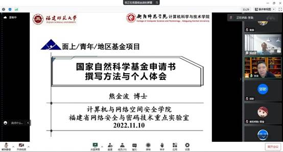 2022年11月10日20:00,beat3652023年度国家自然科学基金申报交流会使用腾讯会议线上召开,特邀福建师范大学熊金波教授作学术报告,会议由beat365院长李浪教授主持,beat365唯一官网部分老师及研究生参加了此次会议。