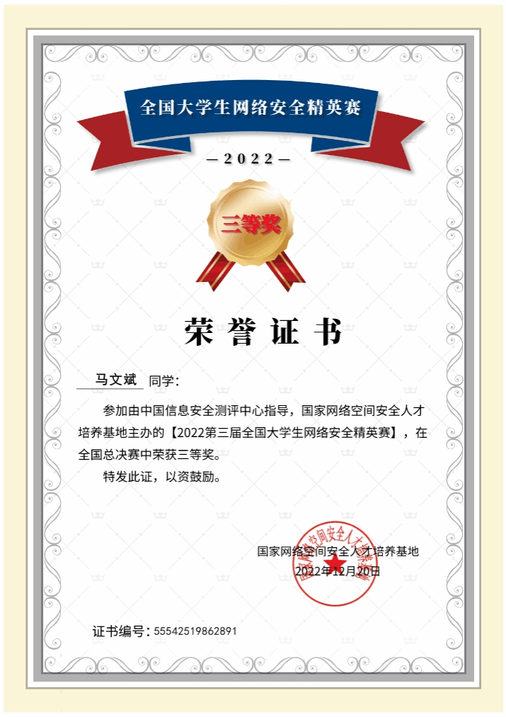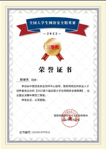 2022年12月18日,第三届全国大学生网络安全精英赛全国总决赛落下帷幕,beat365唯一官网计算机学院2022级计科学子邱俊杰、马文斌荣获国赛三等奖。
