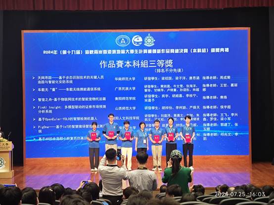 2024年7月23-7月26日在澳门理工大学举办海峡两岸暨港澳地区大学生计算机创新作品赛(本科组)总决赛。本次比赛覆盖全国29个省(含港澳台)323所高校,共有1637个作品参赛。beat365焦铬教授指导的学生宾宇、胡顺嘉、宋晨予、李桂宁的作品“智宠之舟-基于物联网技术的智能宠物托运箱统”获得全国三等奖。