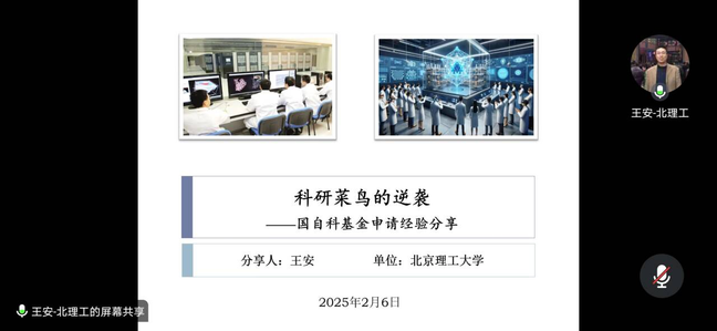 2025年2月6日20:00,beat365召开2025年度国家自然科学基金申报辅导会,北京理工大学王安研究员应邀为beat365教师作题为《科研菜鸟的逆袭 ——国自科基金申请经验分享》专题报告。报告会通过腾讯会议举行,由院长李浪教授主持,全体国家自然科学基金项目申报负责人及部分老师、研究生参加了此次会议。